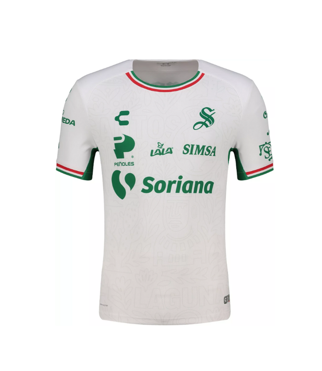 The jersey's artwork is inspired by one of the club's most important adjectives: LOS GUERREROS, an adjective that represents the strength, determination of the board and players, as well as the constant support of the fans, always steadfast in the pursuit of new achievements. In addition, the design celebrates the Santosmania, which has become popular and continues to fight. Projected from the emblematic TSM Stadium, it exudes celebration, joy, teamwork and glory. This jersey pays homage to the unique connection between players and fans, all united for the same goal. Elements from the area, such as Sarabia's plane and the Mexican finch representative of the region, complete the design, reflecting the identity and power of Los Guerreros. With a regular fit, ribbed V-neck and classic sleeves, the club shield stands out in 3D silicone. It has a special packaging that includes stickers with the jersey prints, allowing fans to always show their love for the team.