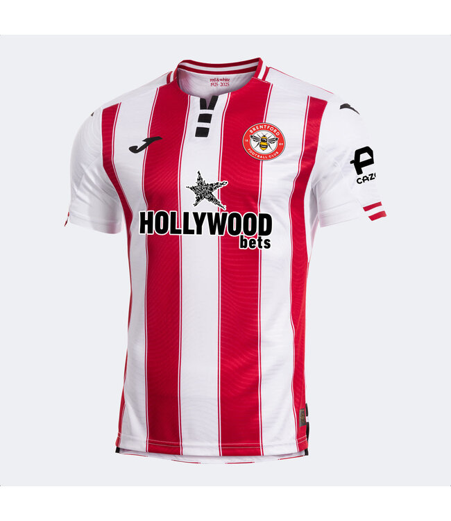 The Brentford FC crest appears in silicone, while the Joma logo is displayed through printing. The jersey includes two commemorative details: inside the collar, the inscription “RED & WHITE 1925-2025,” and on the back, the number “100,” both honoring the club’s centenary and its emblematic colors. Celebrate Brentford FC’s centenary with their iconic home kit jersey!